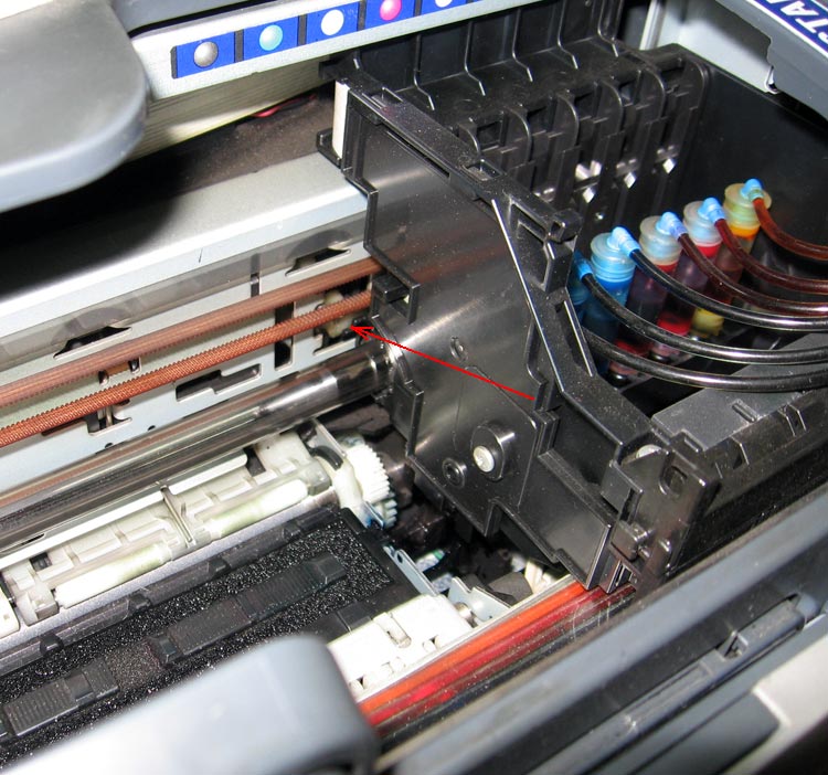 2. Слева от каретки принтера имеется белый рычажок, его нужно легонько толкнуть от себя внутрь принтера, это разблокирует каретку, и даст нам возможность свободно двигать ее руками.